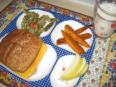 pesto pasta (pesto + whole wheat rotini), roasted sweet potato wedges, apples, and a sloppy joe (+ cheese) on a whole wheat bun